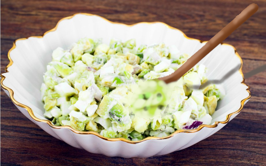 - Nuluptą obuolį, avokadą ir vištieną supjaustyti smulkiais kubeliais. Svogūną smulkiai sukapoti.